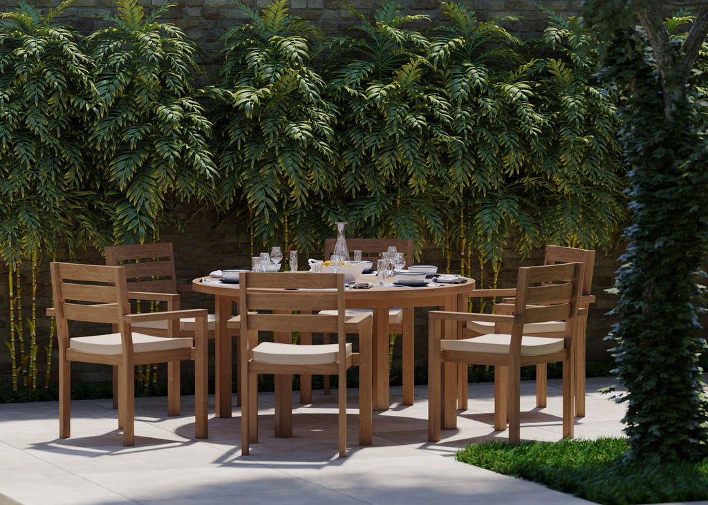 Accompanying this exquisite Luxor table is six contemporary Marlow teak Stacking chairs, a luxurious addition to any outdoor space. The Marlow chair is our signature design and is Constructed from sustainable Teak, these chairs are expertly finished, for durability and style. The Marlow stacking chair is known for its robust durability, making it the perfect choice for outdoor use in any climate with minimal upkeep needed. Furthermore, the chairs are conveniently stackable up to four units high, allowing you to free up space as needed.