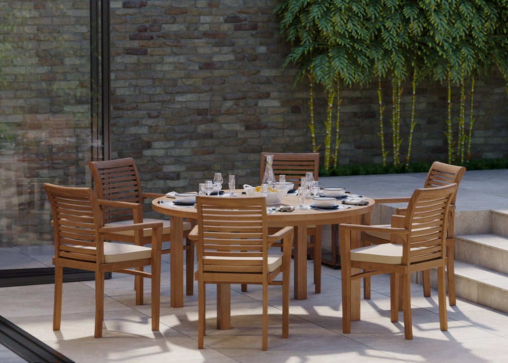 Accompanying this exquisite Luxor table is six Oxford Stacking chairs, with their contemporary horizontal slats, they are crafted from sustainable Teak and sanded to a smooth finish for long life and great looks. They are sturdy and can remain outdoors all year long no matter the weather whilst requiring little maintenance. Additionally, these chairs can be easily stacked so you can reclaim your space when required.