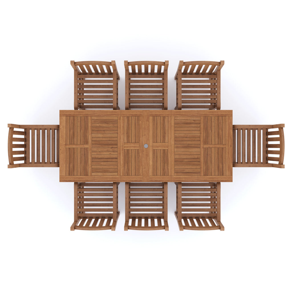 The remarkable solid teak Rectangle 1.8-2.4m garden dining set is a perfect fit for any outdoor space, be it a patio or garden. It amplifies the overall ambiance of an area and becomes its main center of attraction. This set is spacious enough to accommodate large groups of people for comfortable dining. The Rectangle-shaped dining table comes with double leaves, making it expandable from 1.8m to 2.4m in just a few seconds, providing you with the necessary space.