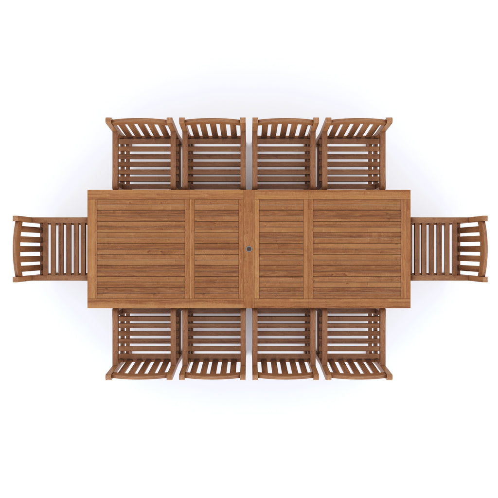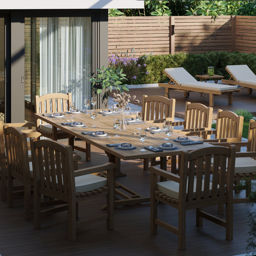 The remarkable solid teak Rectangle 2 - 3m garden dining set is a perfect fit for any outdoor space, be it a patio or garden. It amplifies the overall ambiance of an area and becomes its main center of attraction. This set is spacious enough to accommodate large groups of people for comfortable dining. The Rectangle-shaped dining table comes with double leaves, making it expandable from 2m to 3m in just a few seconds, providing you with the necessary space.