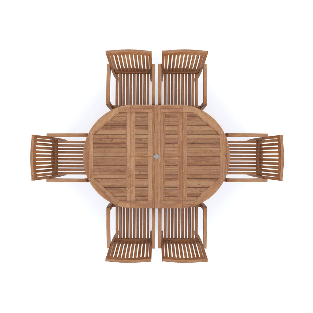 Perfect for enhancing any outdoor area whether it’s a patio or a garden, this exquisite solid teak oval garden dining set comfortably seats four to six people. Designed to be the centrepiece of your outdoor space, the set includes double leaves that allow the table to expand from 120cm to 170cm when additional space is required.