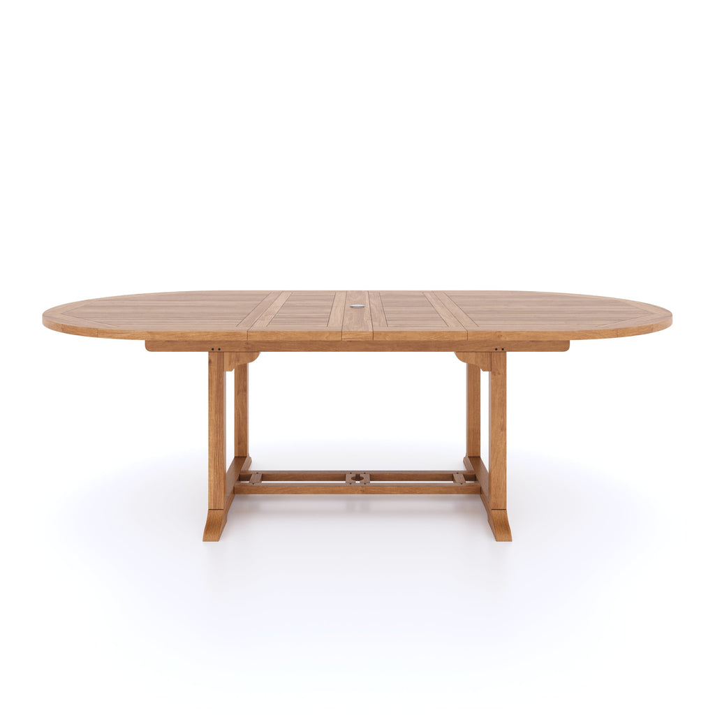 With the addition of this 8-seater Teak garden furniture set, you can effortlessly enhance the ambiance of your outdoor space. Whether your patio or garden is decorated with a traditional or contemporary theme, this furniture set is versatile enough to blend in completely. Its unique design, combined with the quality of its materials, make it an ideal focal point for any setting. What's more? Its thick top table extends from 180cm-240cm within seconds, thanks to the built-in double extension leaves that allow you to adjust the table size according to your preferences. You can set the table in three different sizes, and at the smallest setting, the parasol hole remains functional, providing all the protection you may need on a sunny day.