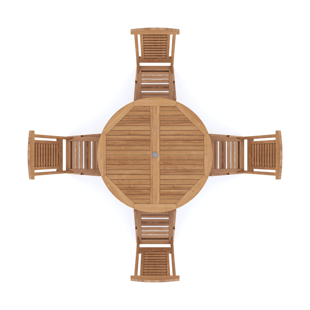 Having a table that has two leaves has multiple advantages. One of the major pros is that you can set it up to cater to three different sizes, depending on your specific requirements. What's even more impressive is that even when fully closed, the table retains the option of using your parasol hole which can accommodate a thick stem parasol. Furthermore, for those that prefer a flush finish, the table also comes with a teak parasol plug that fits seamlessly. To add another feather to its cap, the table is finely sanded and has a natural finish that gives it an elegant look.