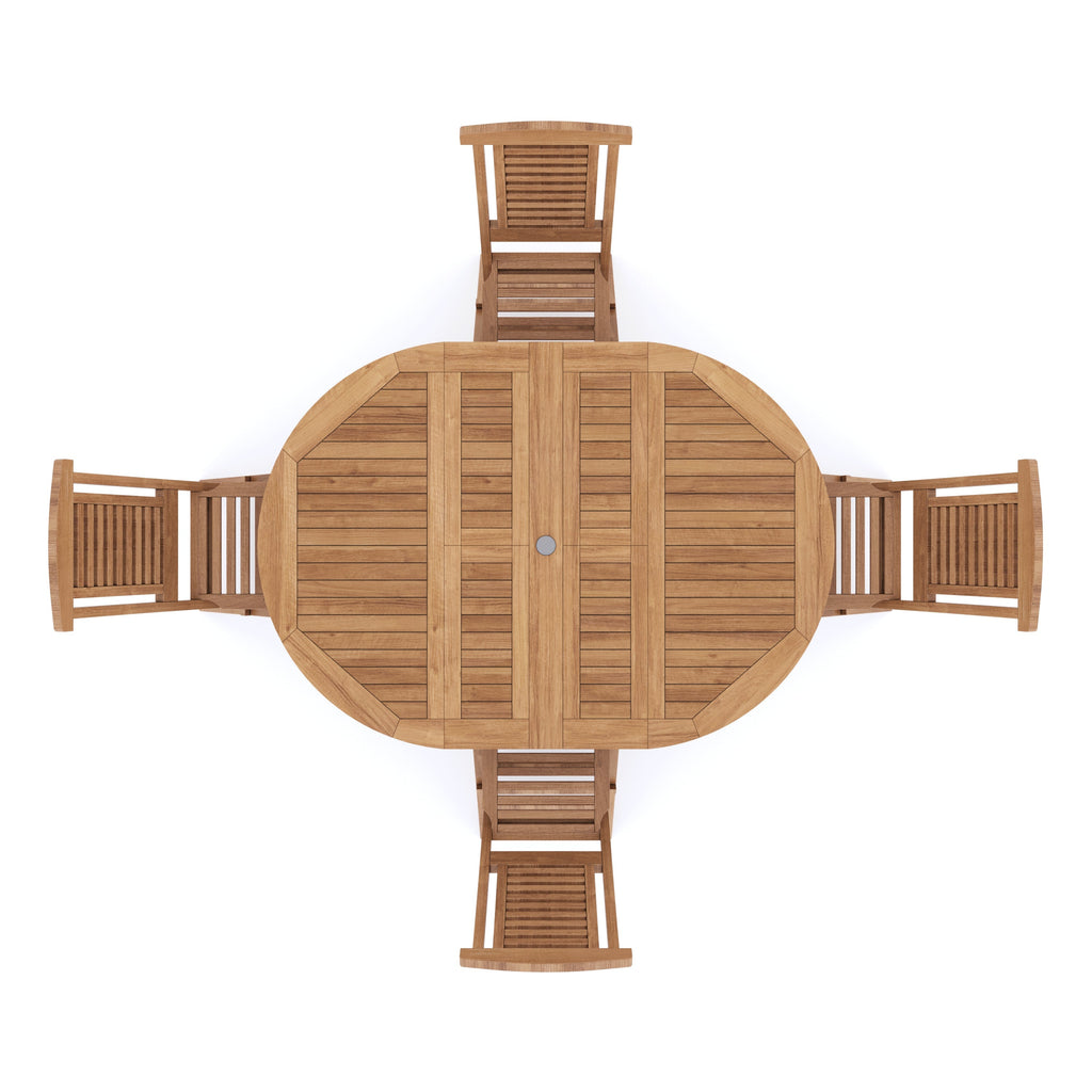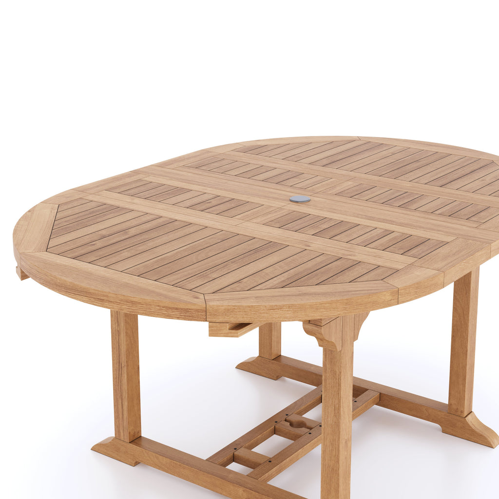 The remarkable solid teak oval garden dining set is a perfect fit for any outdoor space, be it a patio or garden. It amplifies the overall ambiance of an area and becomes its main center of attraction. This set is spacious enough to accommodate four to six people for comfortable dining. The oval-shaped dining table comes with double leaves, making it expandable from 120cm to 170cm in just a few seconds, providing you with the necessary space.