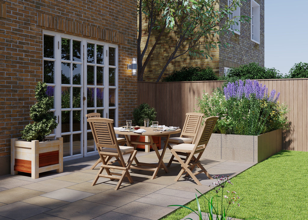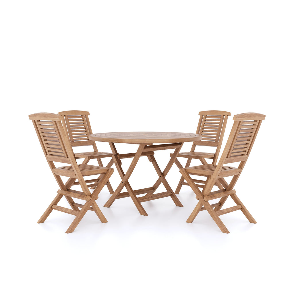Introducing our superbly crafted, sustainable teak garden furniture set comprising of a 120cm Spiral Folding Table with a concentric circle design and a 4cm extra thick table top. The set comes with 4 matching Hampton folding chairs and free cushions.