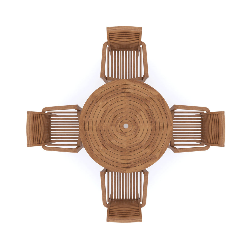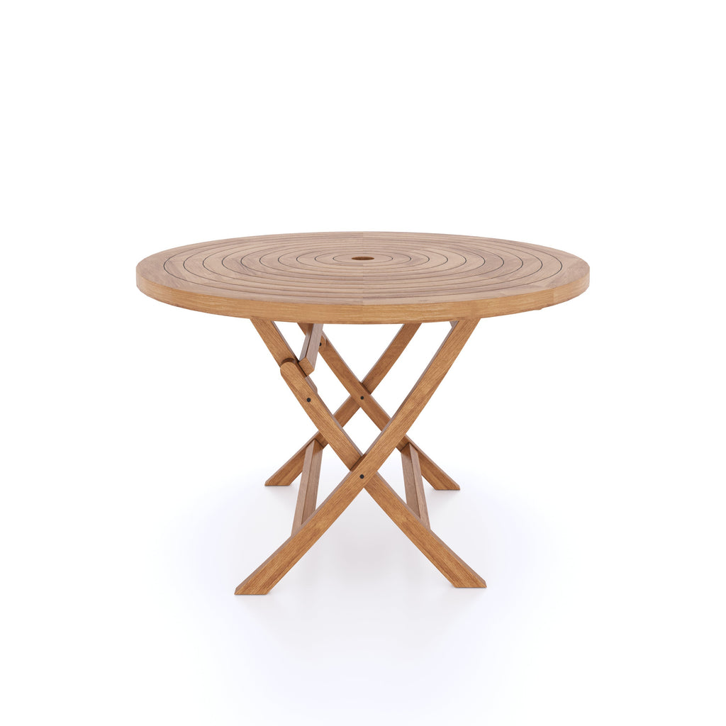 Made from sustainably sourced teak, the Spiral Round Folding Table features concentric circles that radiate from its centre to the edges of the table for a striking design. With a 120cm diameter and 4cm thick table top, the table comfortably accommodates 4 guests and can be left outside all year round thanks to the weather resistant and highly durable nature of premium teak wood. The flush fitting plug also allows for parasol use when necessary.