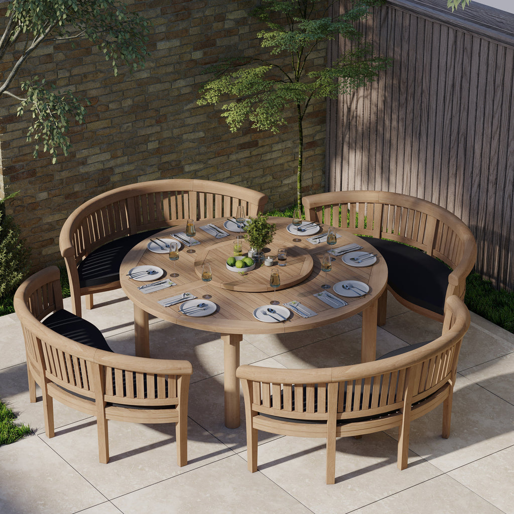 Crafted from sustainable teak and fine sanded for durability and style, this circular garden table measuring 180cm in diameter and paired with four equally-sturdy San Francisco benches makes for a spacious outdoor dining set perfect for hosting up to 12 guests with ease. Our teak furniture boasts exceptional weather resistance and low maintenance requirements, an excellent choice for eco-conscious individuals, featuring fully sustainable SVLK-certified materials from purposely grown teak plantations.