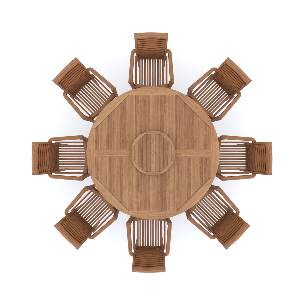 Indulge in the luxury of outdoor dining with our exquisite Maximus 180cm Round teak garden table ensemble, complete with 8 durable teak oxford stacking chairs. A masterpiece of sustainability, this set has been thoughtfully crafted using only the finest, eco-friendly and highly durable teak material. With a 40mm thick table top and flawlessly smooth finish that promises to withstand the test of time, our Maximus tables are built to endure even the harshest weather conditions without any compromises on style or strength. Take pleasure in the outdoors with minimal maintenance required, as our set is designed to stay outdoors all year long. Our Sturdy Maximus tables guarantee a premium outdoor dining experience like no other.