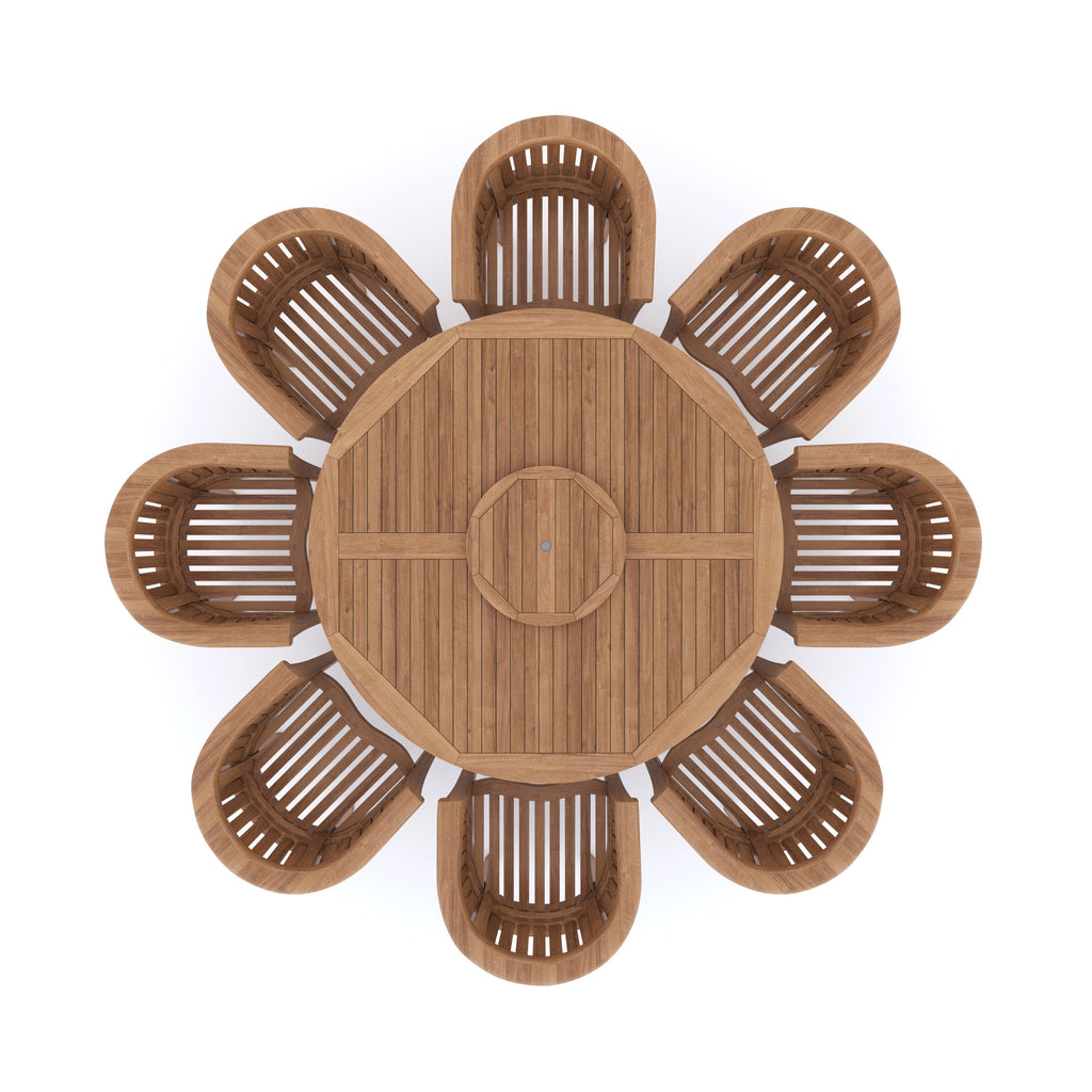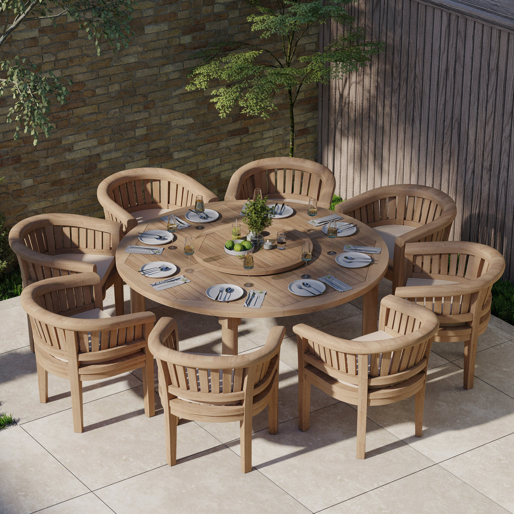 This beautiful 180cm Round teak garden table comes with 8 San Francisco Chairs. The set has been crafted from sustainable SVLK certified teak and is sanded to a smooth finish for long life and great looks. The set can remain outdoors all year long, no matter the weather and requires little maintenance.