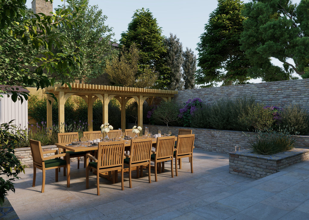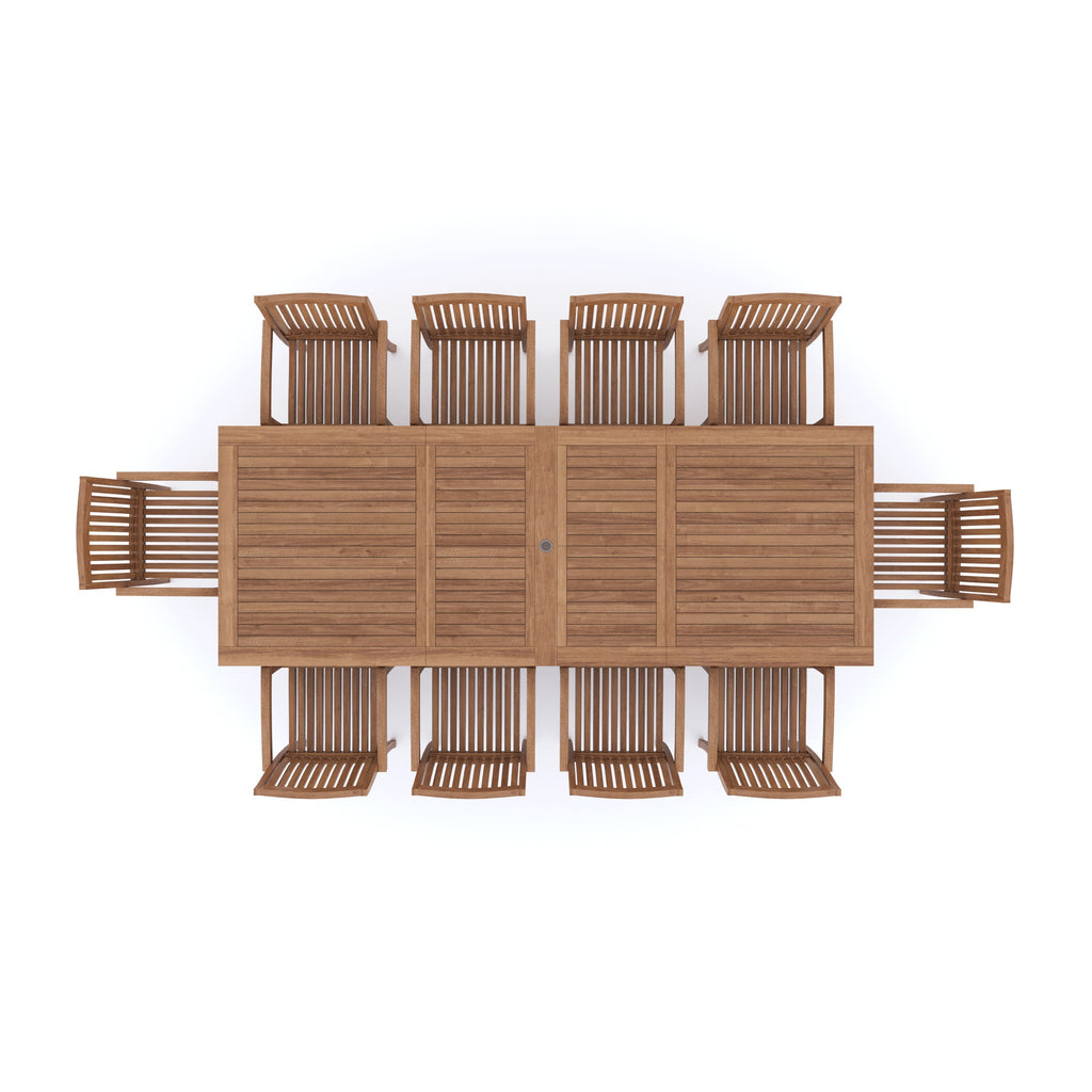 The remarkable solid teak Rectangle 2-3m garden dining set is a perfect fit for any outdoor space, be it a patio or garden. It amplifies the overall ambiance of an area and becomes its main center of attraction. This set is spacious enough to accommodate large groups of people for comfortable dining. The Rectangle-shaped dining table comes with double leaves, making it expandable from 2m to 3m in just a few seconds, providing you with the necessary space.