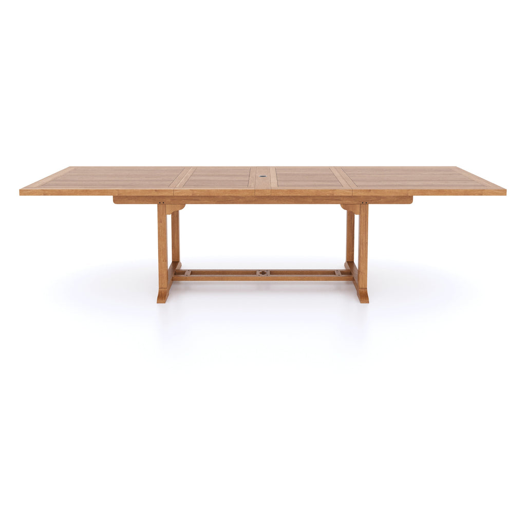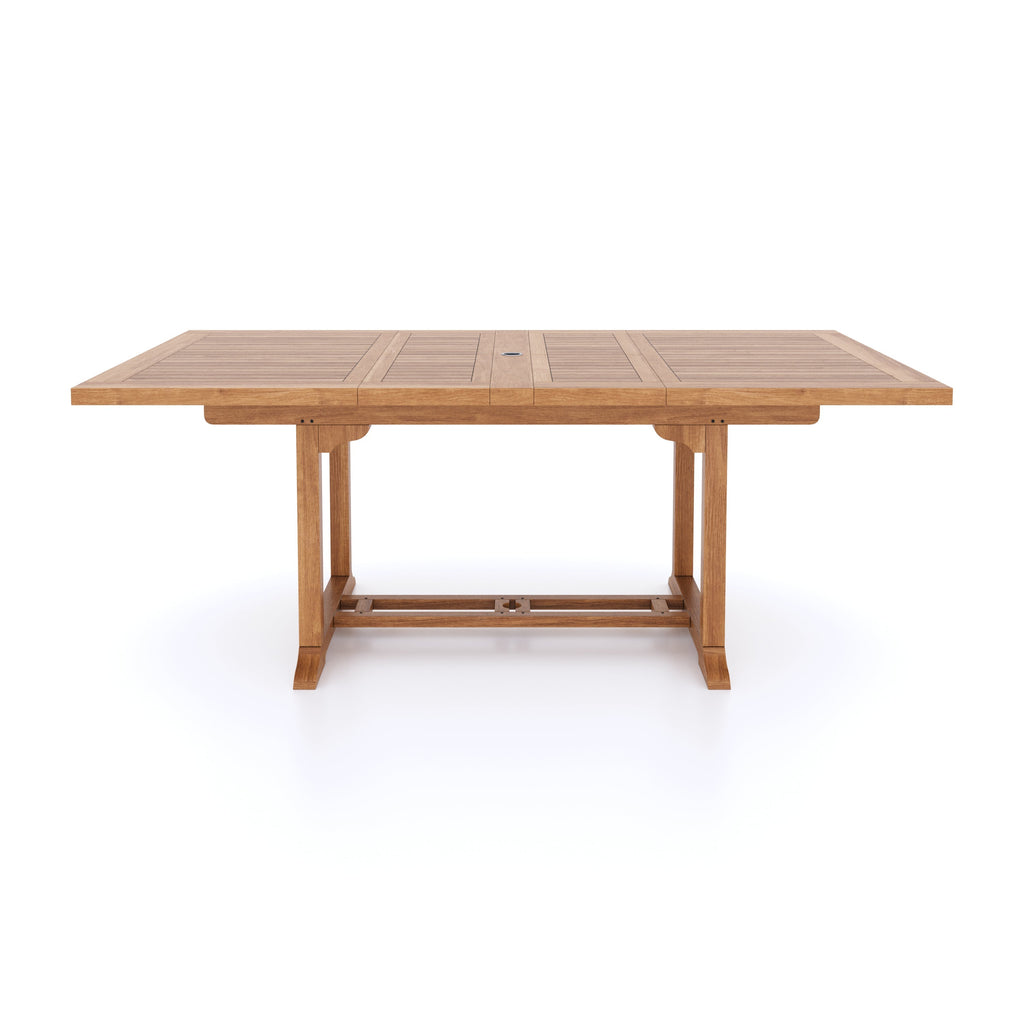 Having a table that has two leaves has multiple advantages. One of the major pros is that you can set it up to cater to three different sizes, depending on your specific requirements. What's even more impressive is that even when fully closed, the table retains the option of using your parasol hole, Which can accommodate a parasol with either a small or a thick stem. Furthermore, for those that prefer a flush finish, the table also comes with a teak parasol plug that fits seamlessly. To add another feather to its cap, the table is finely sanded and has a natural finish that gives it an elegant look.